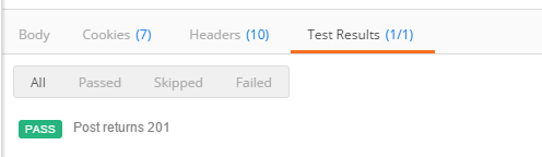 This is a simple test that will pass if the POST method returns 201 and fail if it doesn’t. Click Send to send the request and click the Test Results tab to see the result.
