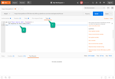 This is a simple test that will pass if the POST method returns 201 and fail if it doesn’t. Click Send to send the request and click the Test Results tab to see the result.